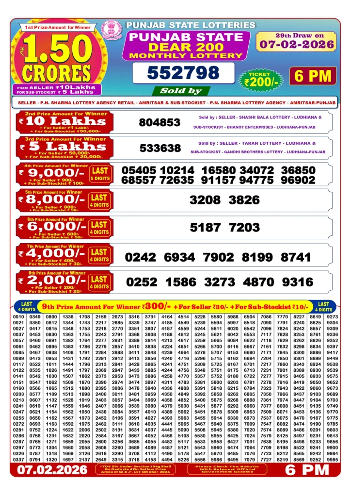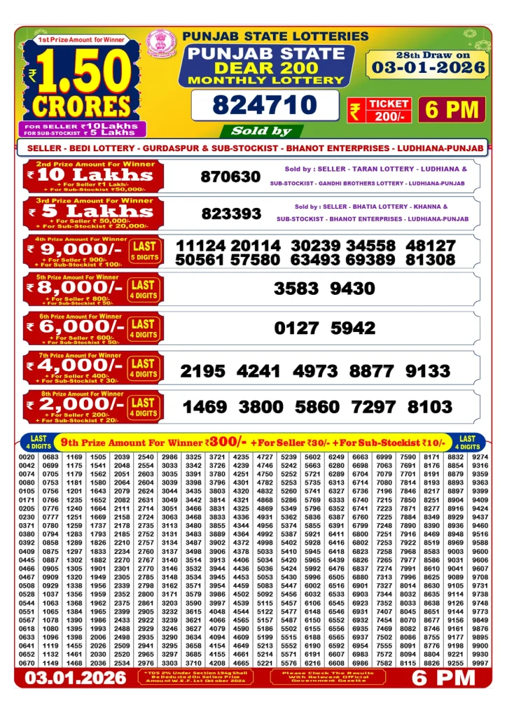 The Punjab State Dear 200 Monthly Lottery results, often referred to as “Lottery Sambad,” are typically announced on specific dates each month. You can find the results through various sources:
